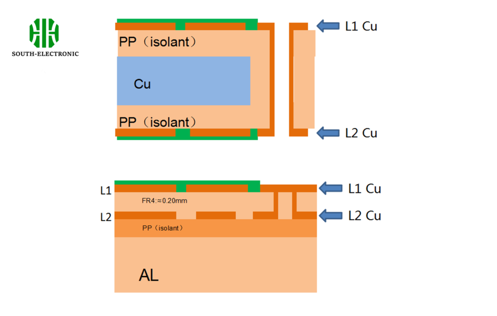 Let’s take a look at two aluminum PCB structures: Double-sided sandwich aluminum substrate and double-sided mixed pressure aluminum substrate