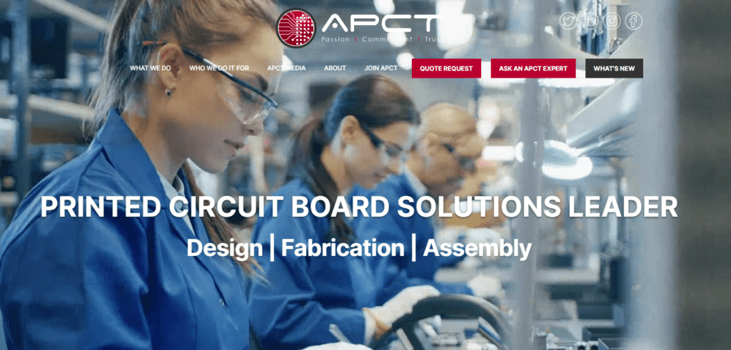 - Company Type: APCT is a manufacturer in the electronics industry, specializing in the design and manufacture of printed circuit boards (PCBs). They focus on low volume, high mix, advanced technology PCBs, including multi-layer rigid, high-density interconnect (HDI), rigid-flex, and flexible circuits .