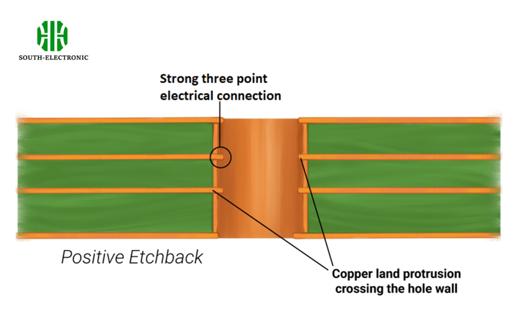 With positive etchback, the copper layers are fully exposed on all sides of the via hole. This creates a three-point connection between the internal copper layers, which enhances electrical performance and reliability. Positive etchback is ideal for high-reliability applications, but the aggressive nature of this technique can introduce stress into the PCB, potentially leading to cracks in the copper.